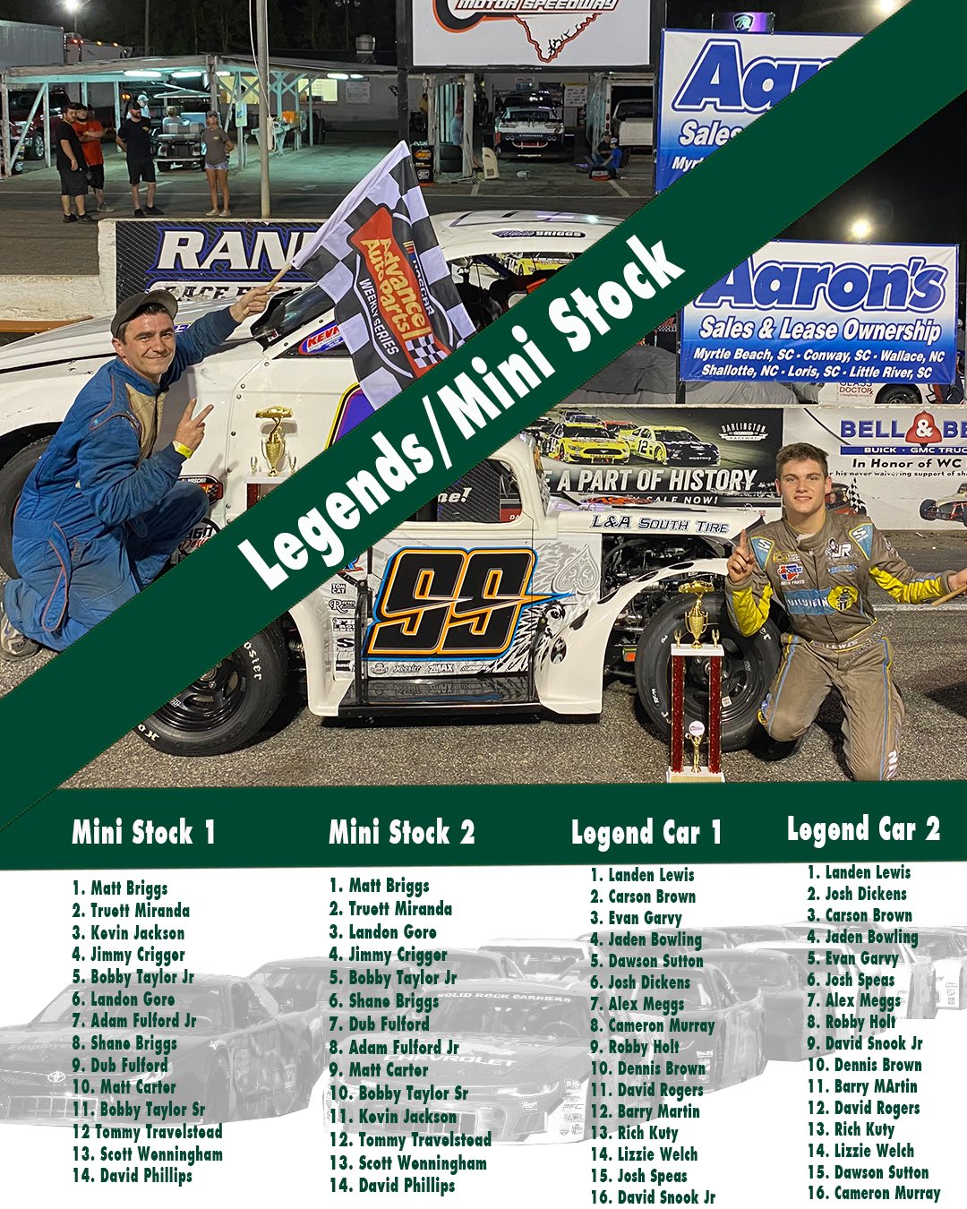 Florence Motor Speedway Pa Twitter Current Points Leaders Late Model Stock Kade Brown Chargers Wayne Locklair Super Trucks Strom Altman Mini Stocks Matt Briggs Allison Legacy Ethan Glenn Legend Cars Jaden Bowling